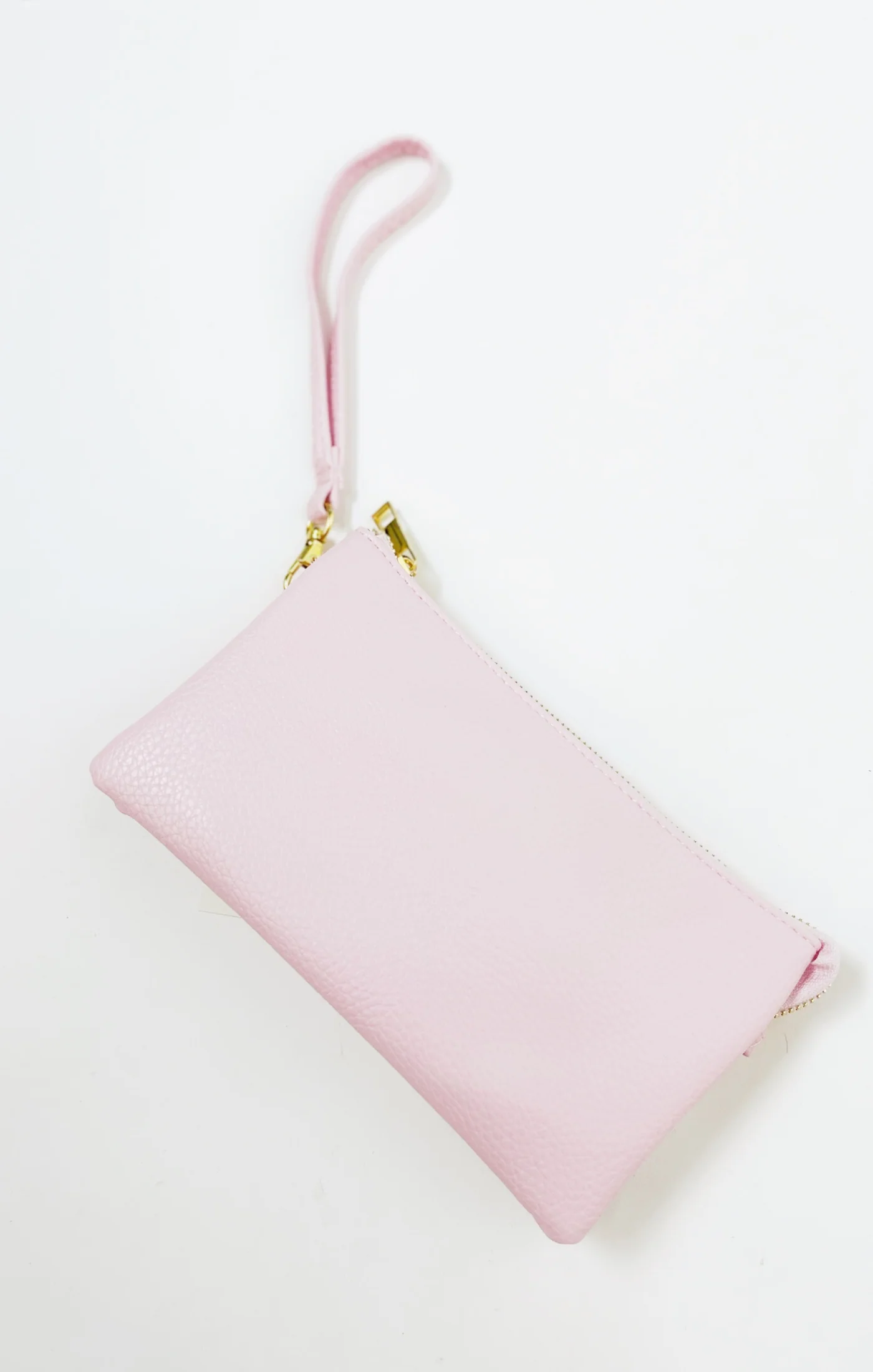 This wristlet comes with 1 detachable 8" wrist strap and 1 cross-body strap adjustable up to 4.5 feet long.